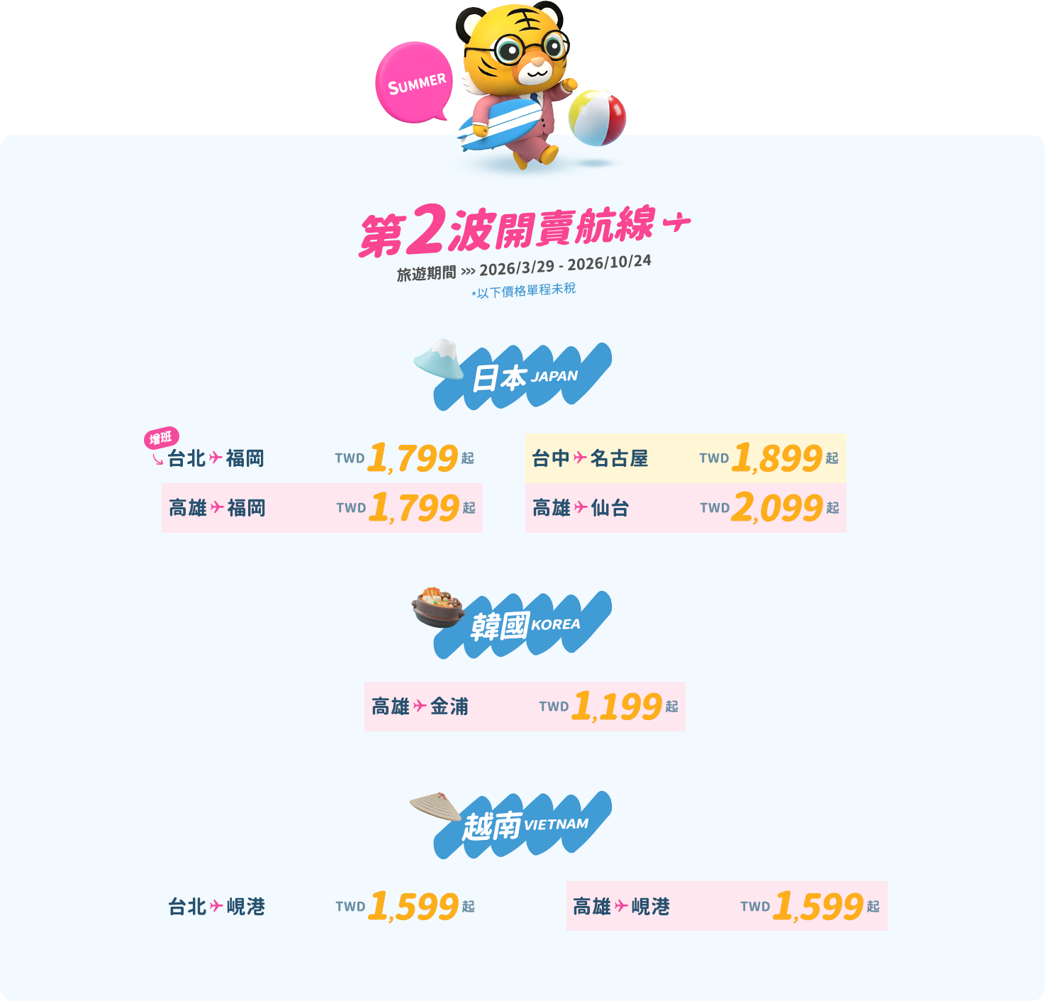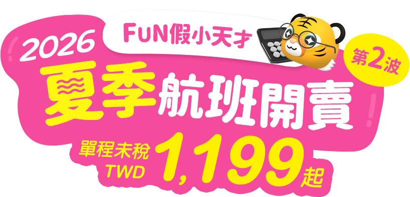 - 本優惠恕不適用於嬰兒票。所有預定均不可退款、不可轉讓。台灣虎航保留更改、修改、取消本次促銷的權利,恕不另行通知。