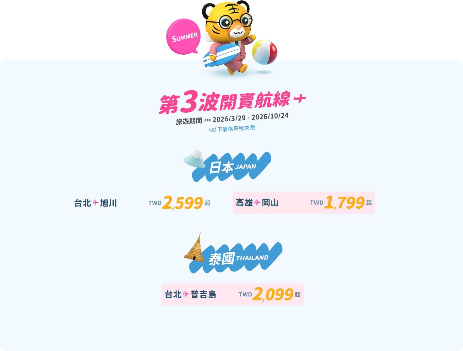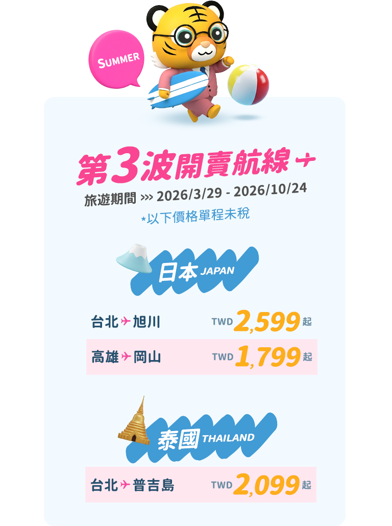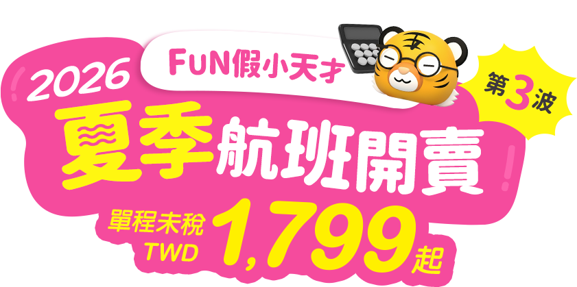 - 本優惠恕不適用於嬰兒票。所有預定均不可退款、不可轉讓。台灣虎航保留更改、修改、取消本次促銷的權利,恕不另行通知。