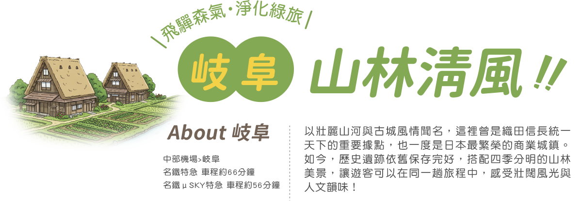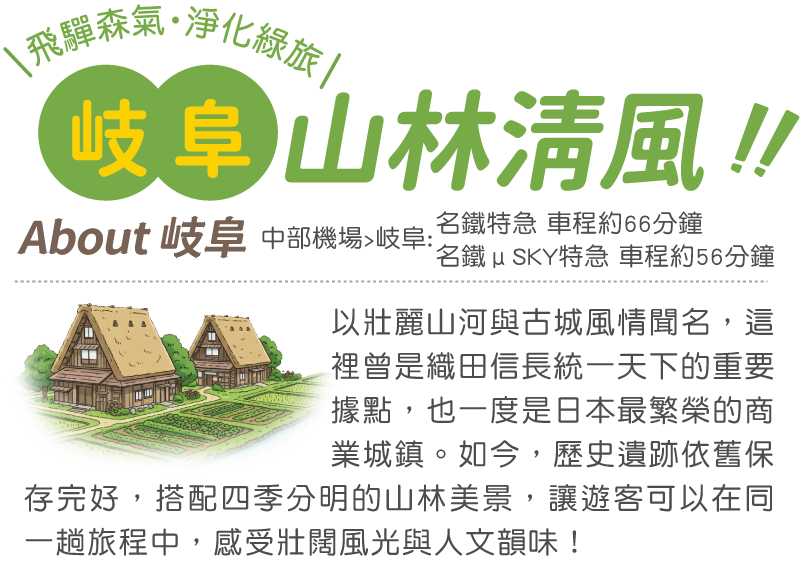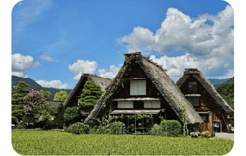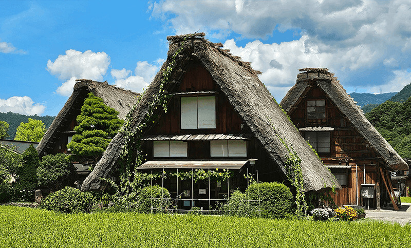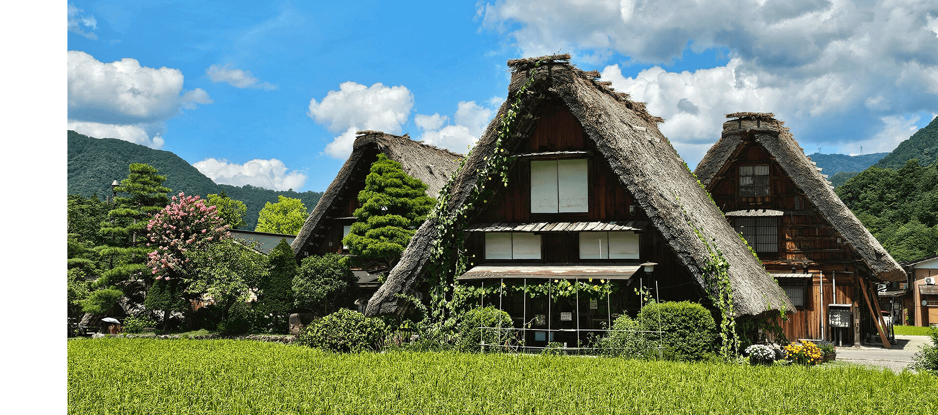 世界遺產合掌村,以茅草屋頂聞名。建築因應豪雪而生,聚落依山傍水,四季風景如童話般靜謐且引人入勝。