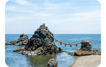兩石用粗繩相連象徵幸福美滿,是著名愛情地標。許多情侶會來此約會,祈求戀愛運甜蜜,是超人氣打卡點。