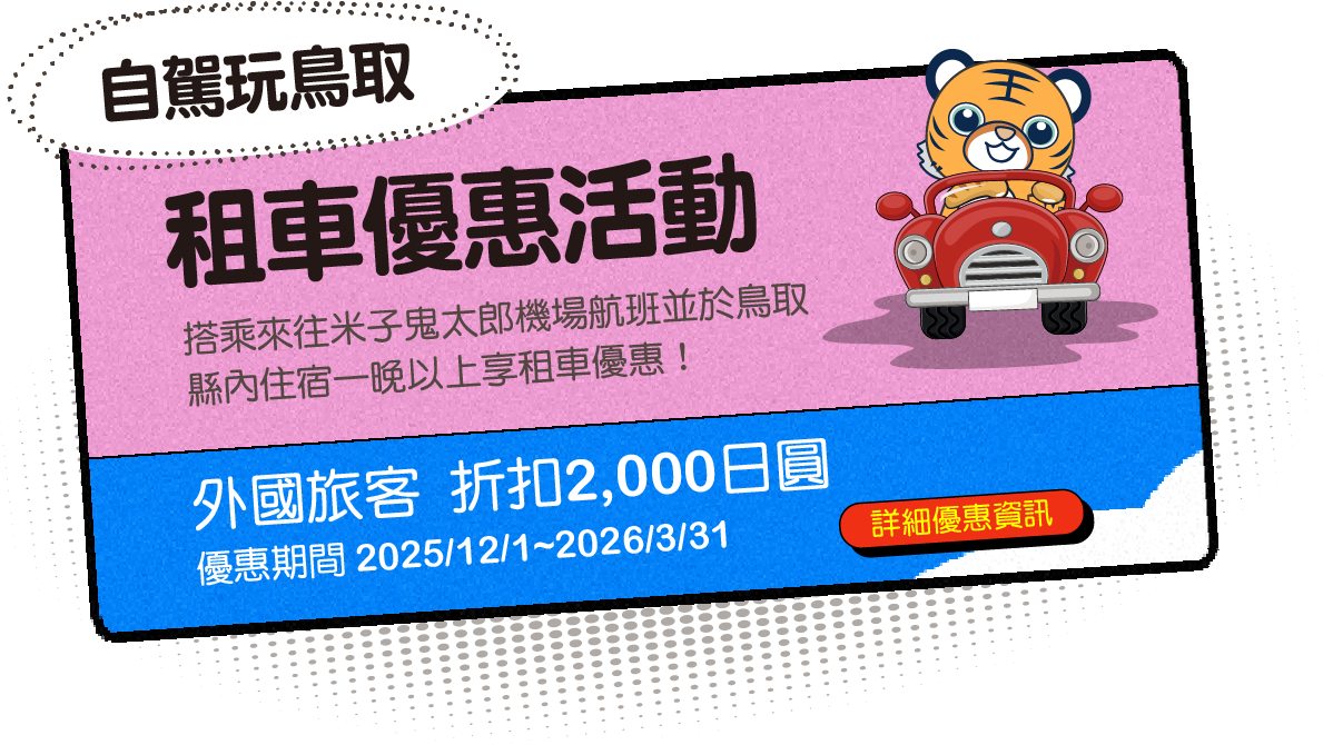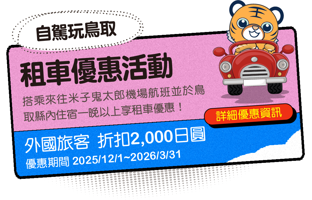 於活動期間內至台灣虎航【鳥取連載中 玩樂不冬眠篇】活動官網完成【SP特別篇 鳥取神秘事件】小測驗,將測驗結果圖片分享至個人 facebook 社群帳號 (貼文需設為公開),並同時於台灣虎航