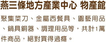 意指燕市與三條市,自江戶時代以來便以金屬製品工藝聞名。聚集了大量製作日式指甲刀、刀具、餐具的專業工廠。其中,燕市更是日本代表性的餐具產地,甚至連諾貝爾獎宴會使用的餐具也出自這裡。