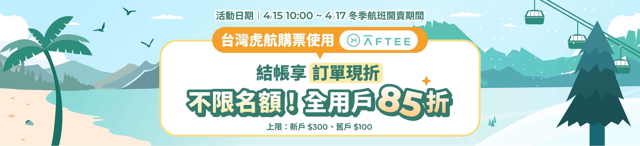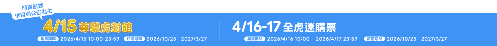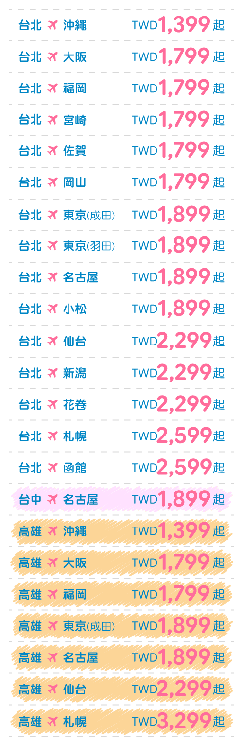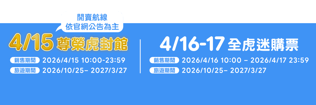 - 本優惠恕不適用於嬰兒票。所有預定均不可退款、不可轉讓。台灣虎航保留更改、修改、取消本次促銷的權利,恕不另行通知。