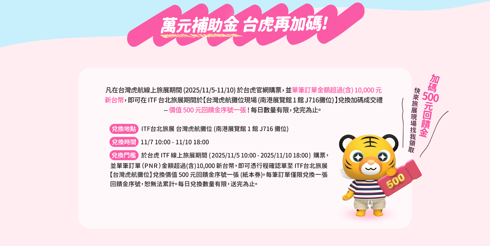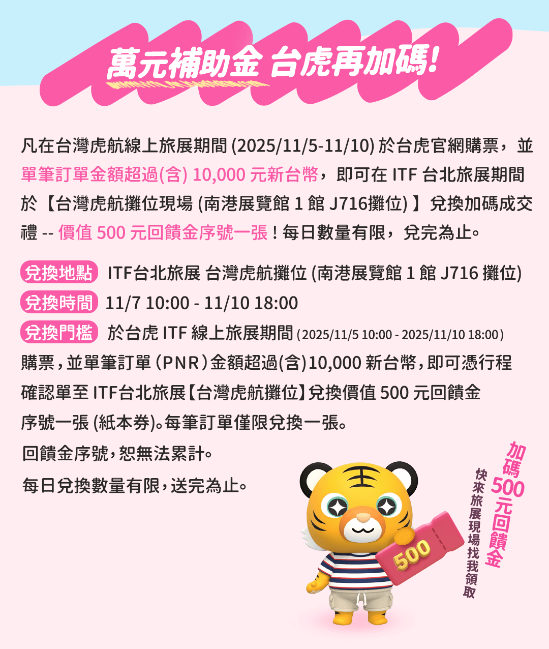 - 兌換方式 : 於台虎 ITF 線上旅展期間 (2025/11/5 10:00 - 2025/11/10 18:00) 購票,並單筆訂單(PNR)金額超過(含) 10,000