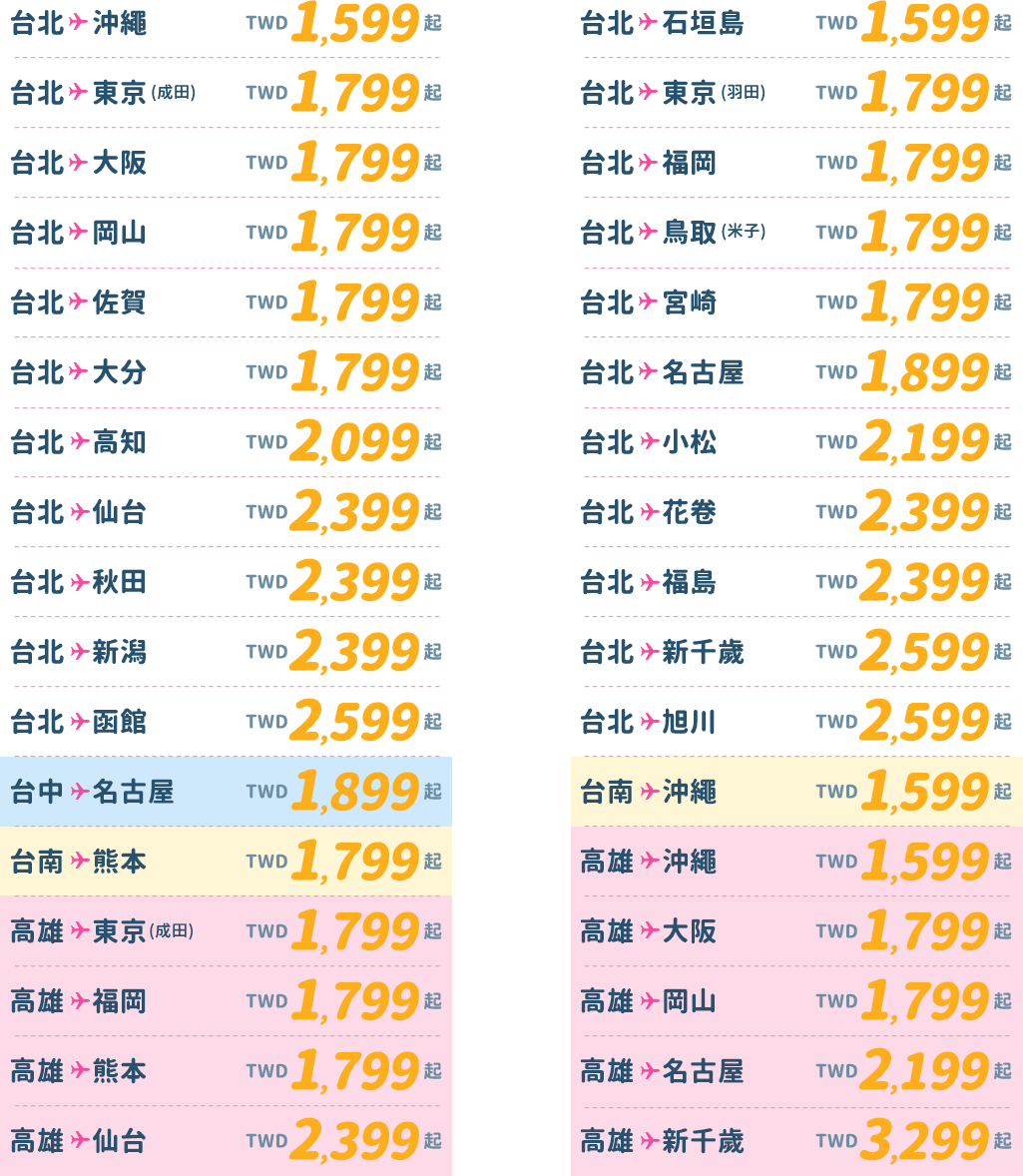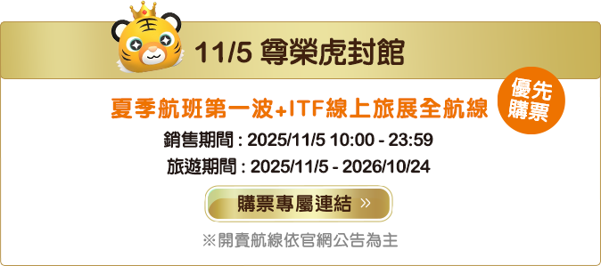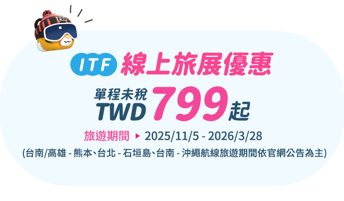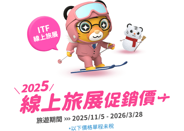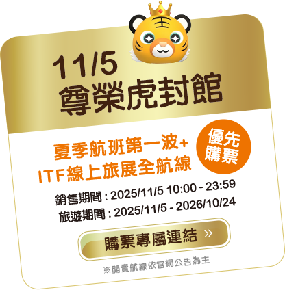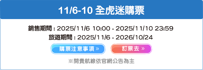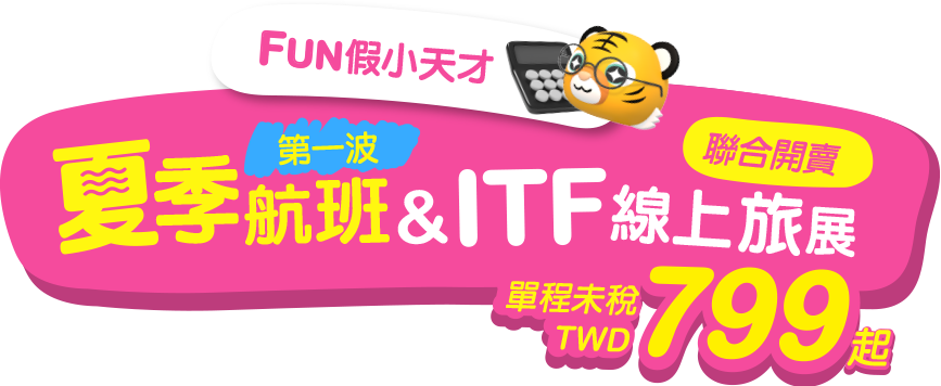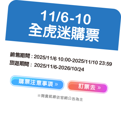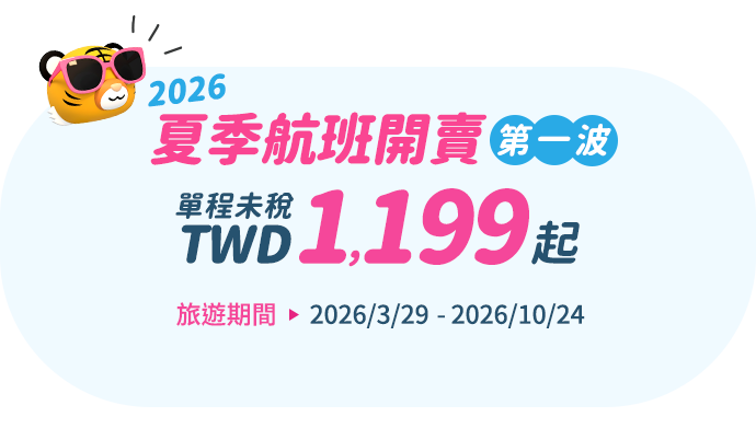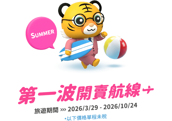 - 本優惠恕不適用於嬰兒票。所有預定均不可退款、不可轉讓。台灣虎航保留更改、修改、取消本次促銷的權利,恕不另行通知。