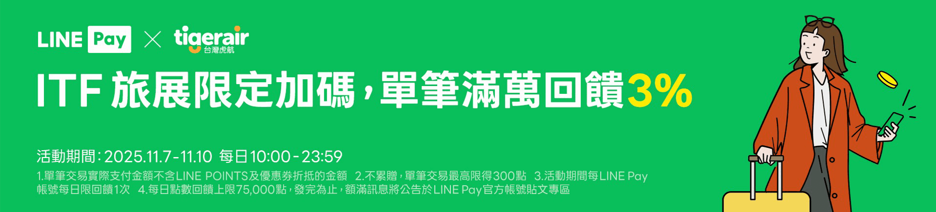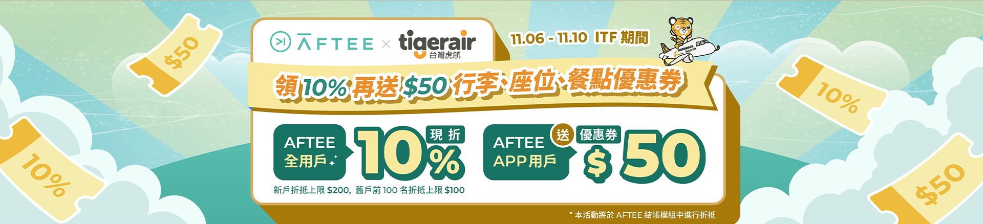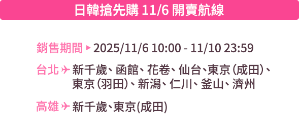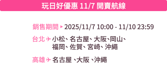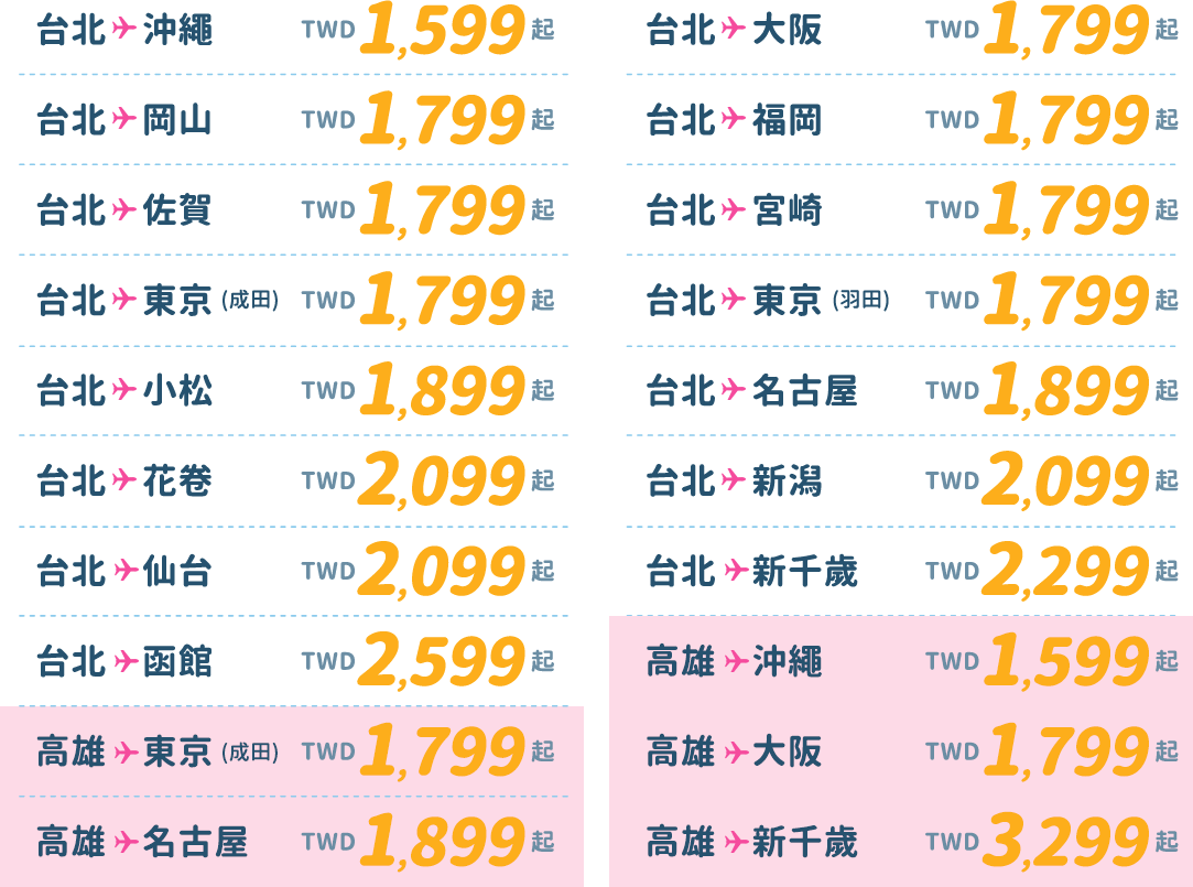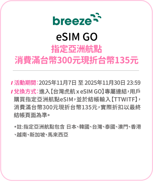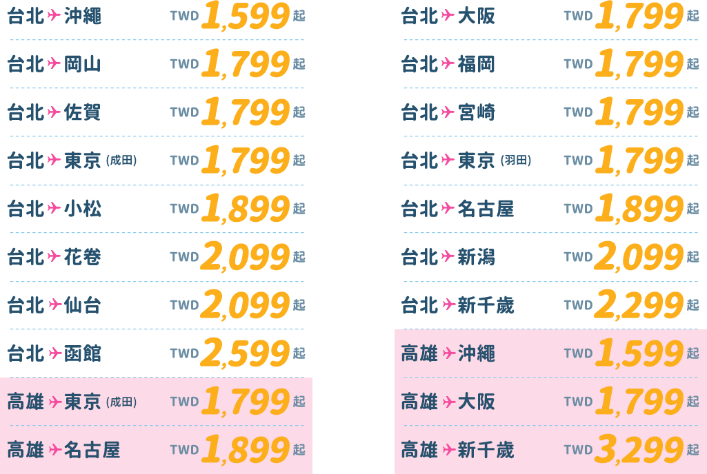 - 本優惠恕不適用於嬰兒票。所有預定均不可退款、不可轉讓。台灣虎航保留更改、修改、取消本次促銷的權利,恕不另行通知。