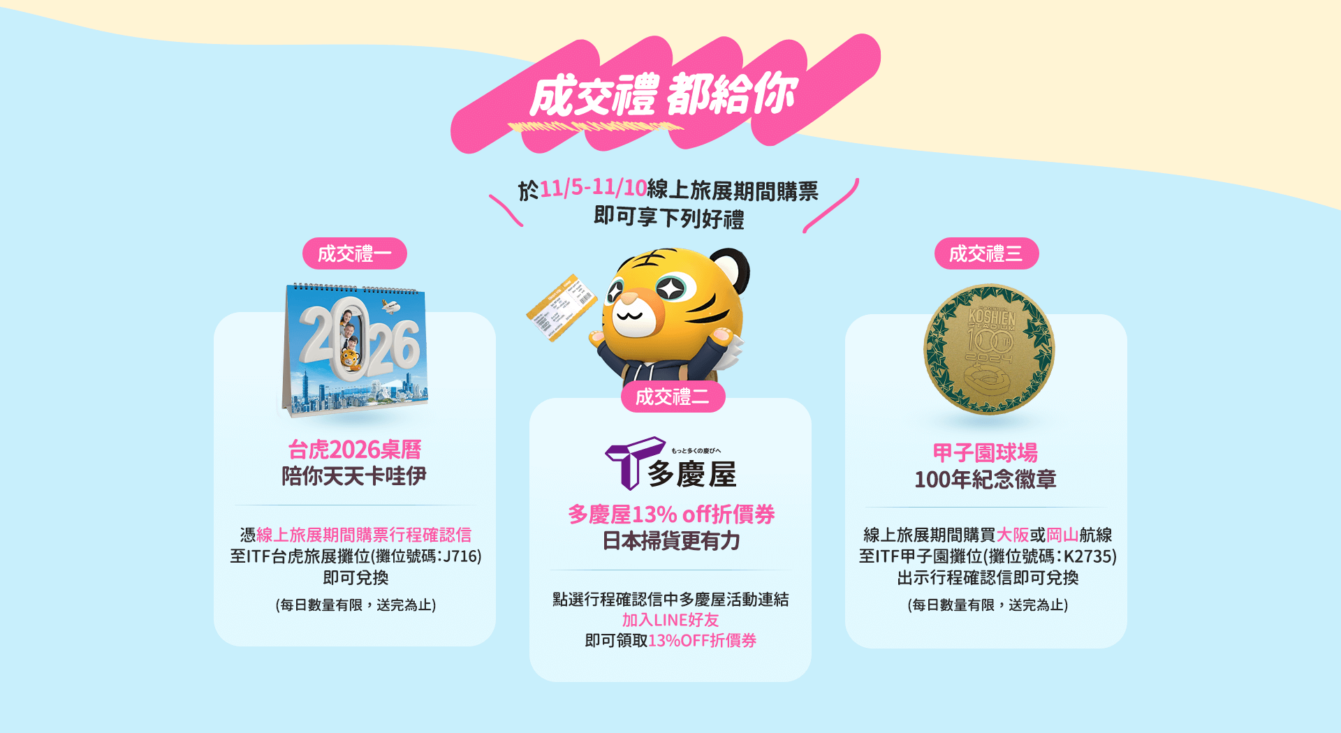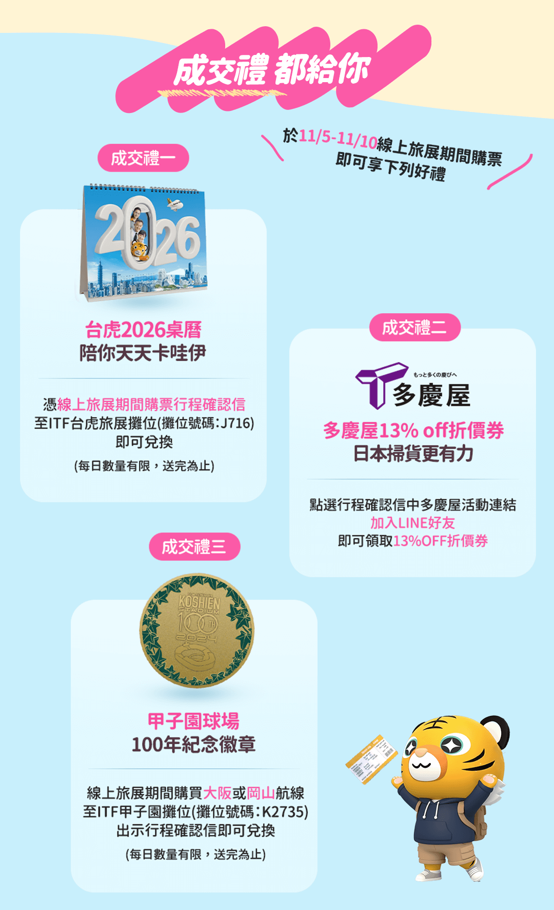 - 兌換方式 : 於台虎 ITF 線上旅展期間 (2025/11/5 10:00 - 2025/11/10 18:00) 購票,並單筆訂單(PNR)金額超過(含) 10,000